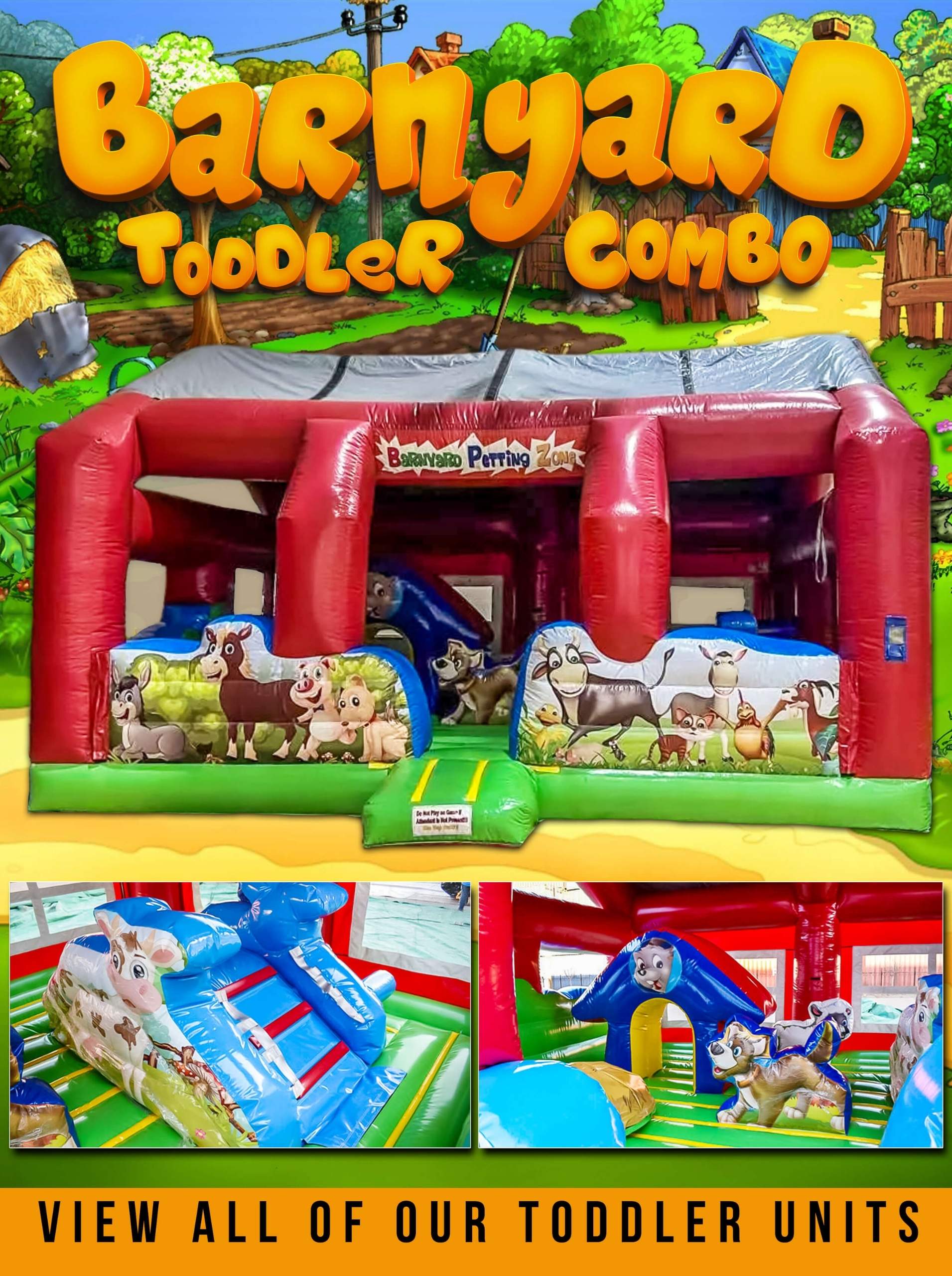 The Barnyard Farm Combo in wet configuration delivers a farm-themed bounce chamber and water slide exit that runs well for mixed-age groups at Lake Bluff summer events. Particularly effective at backyard birthday parties in the residential neighborhoods surrounding the Artesian Trail ravine system — where standard to mid-size lots have the clearance this unit needs — and at Fourth of July gatherings throughout the 60044 ZIP. The best-value wet combo in the Lake Bluff catalog. Same full crew setup and teardown as every other unit in the fleet. Delivers to Lake Forest and North Chicago within the standard service area.